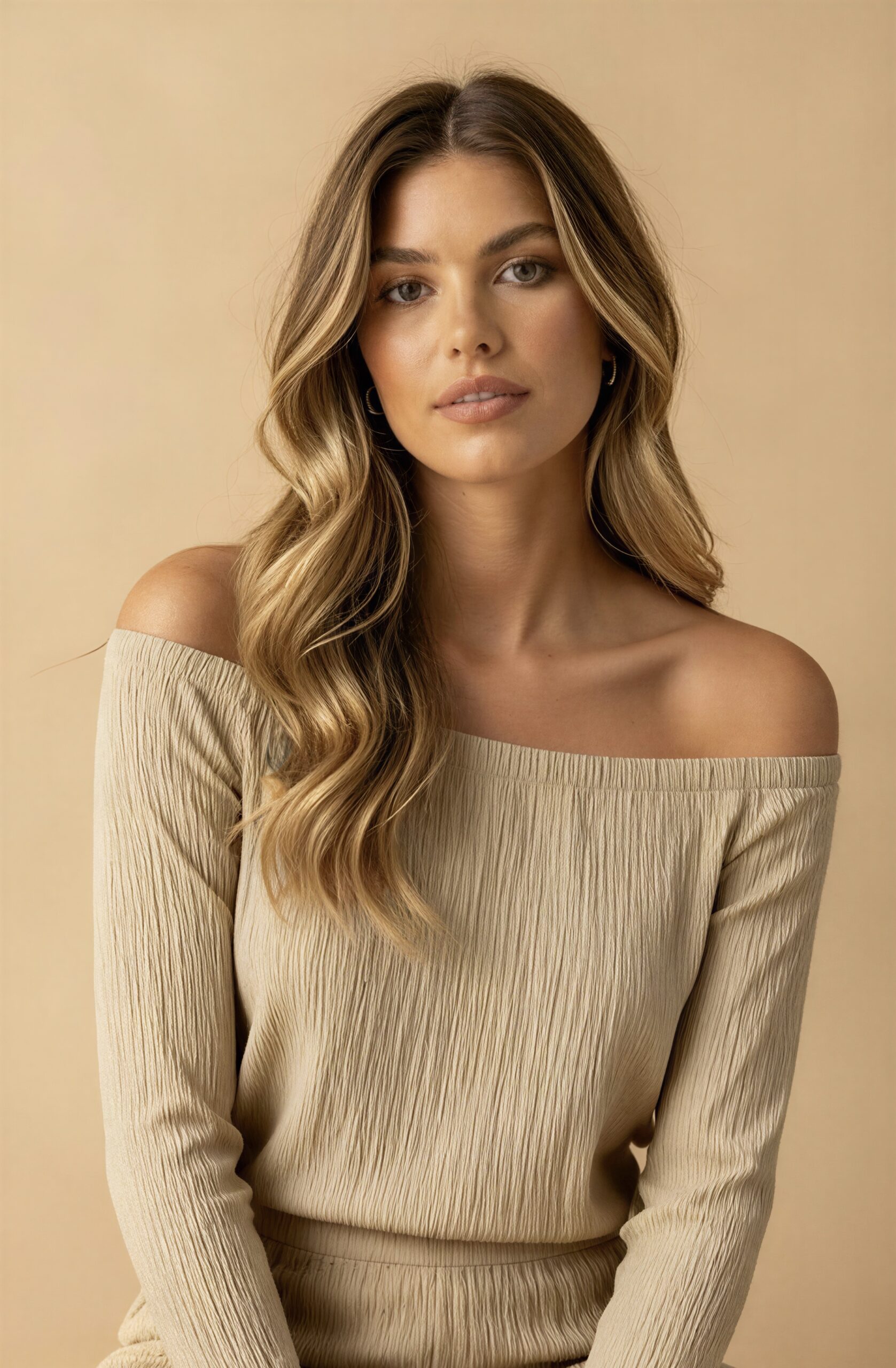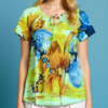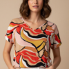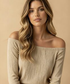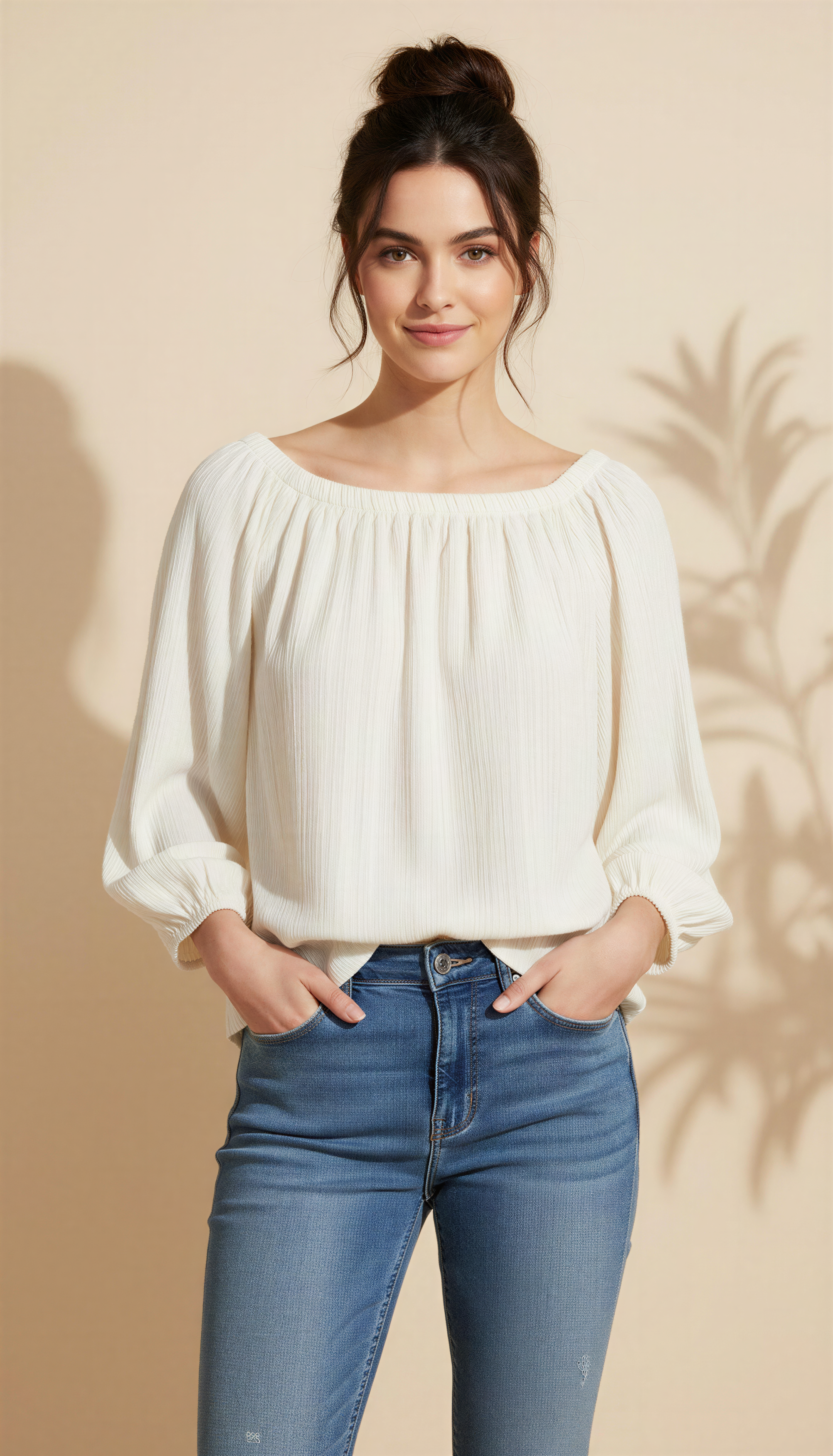 Blusa en tela texturizada, 100% rayón, con elástico en todo el cuello y puños. Largo de mangas 3/4.