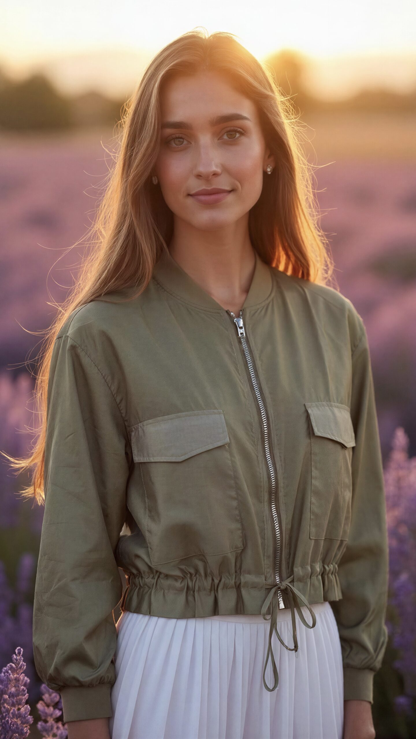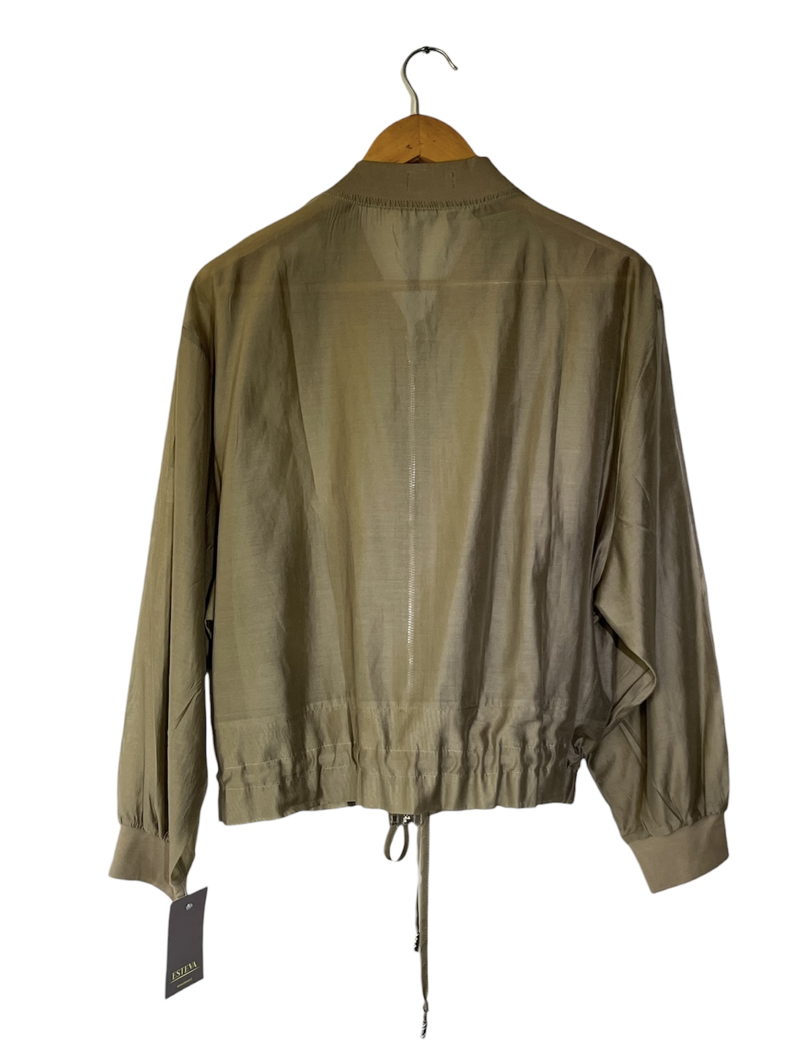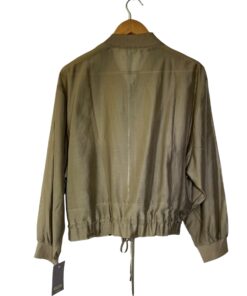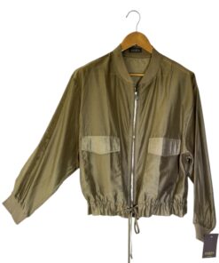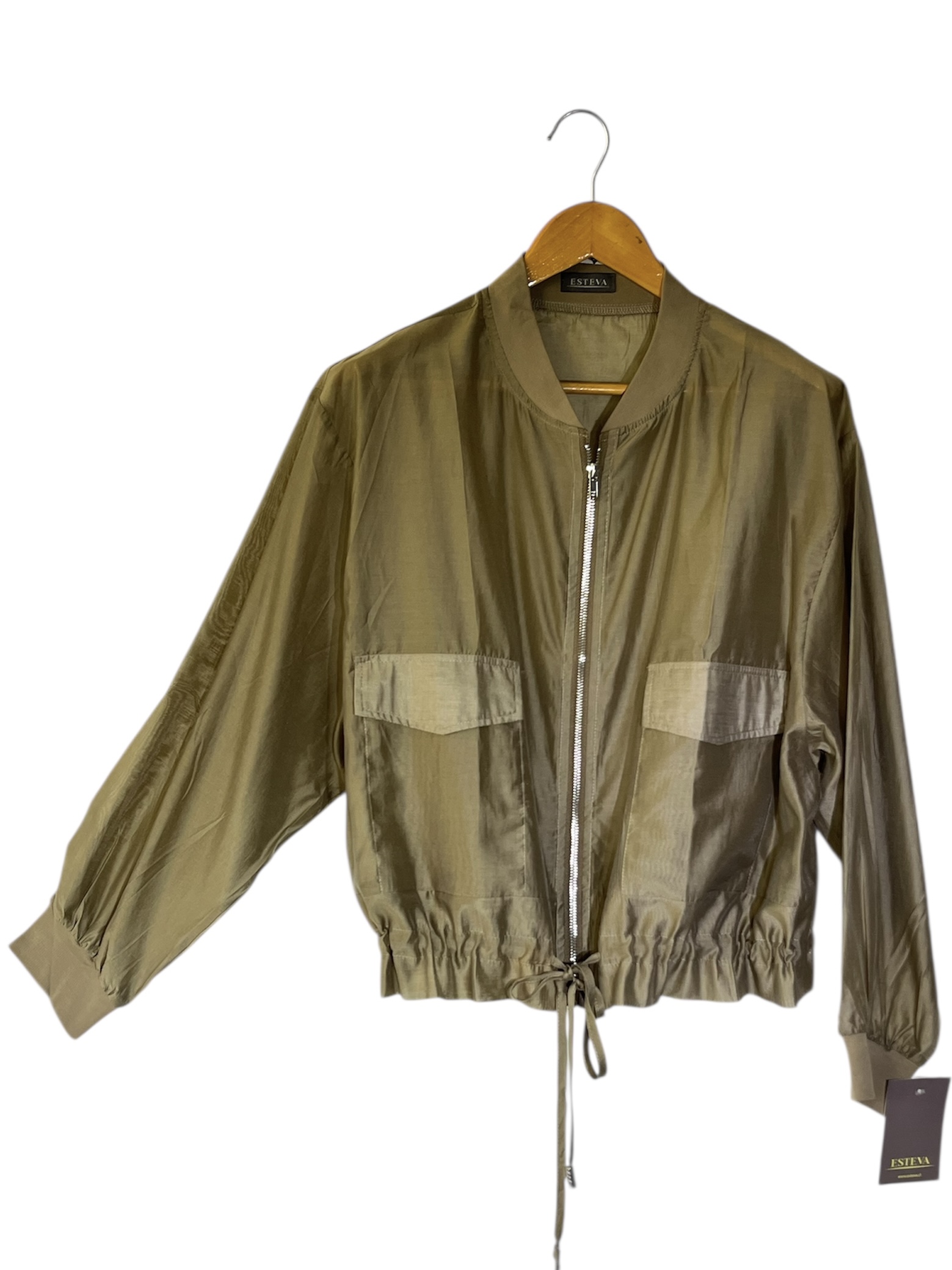 Chaqueta estilo bomber, de gasa. Puños y cuello de jersey. Tiene bolsillos en el delantero, y se recoge en el ruedo con una tira para que quede abombada.