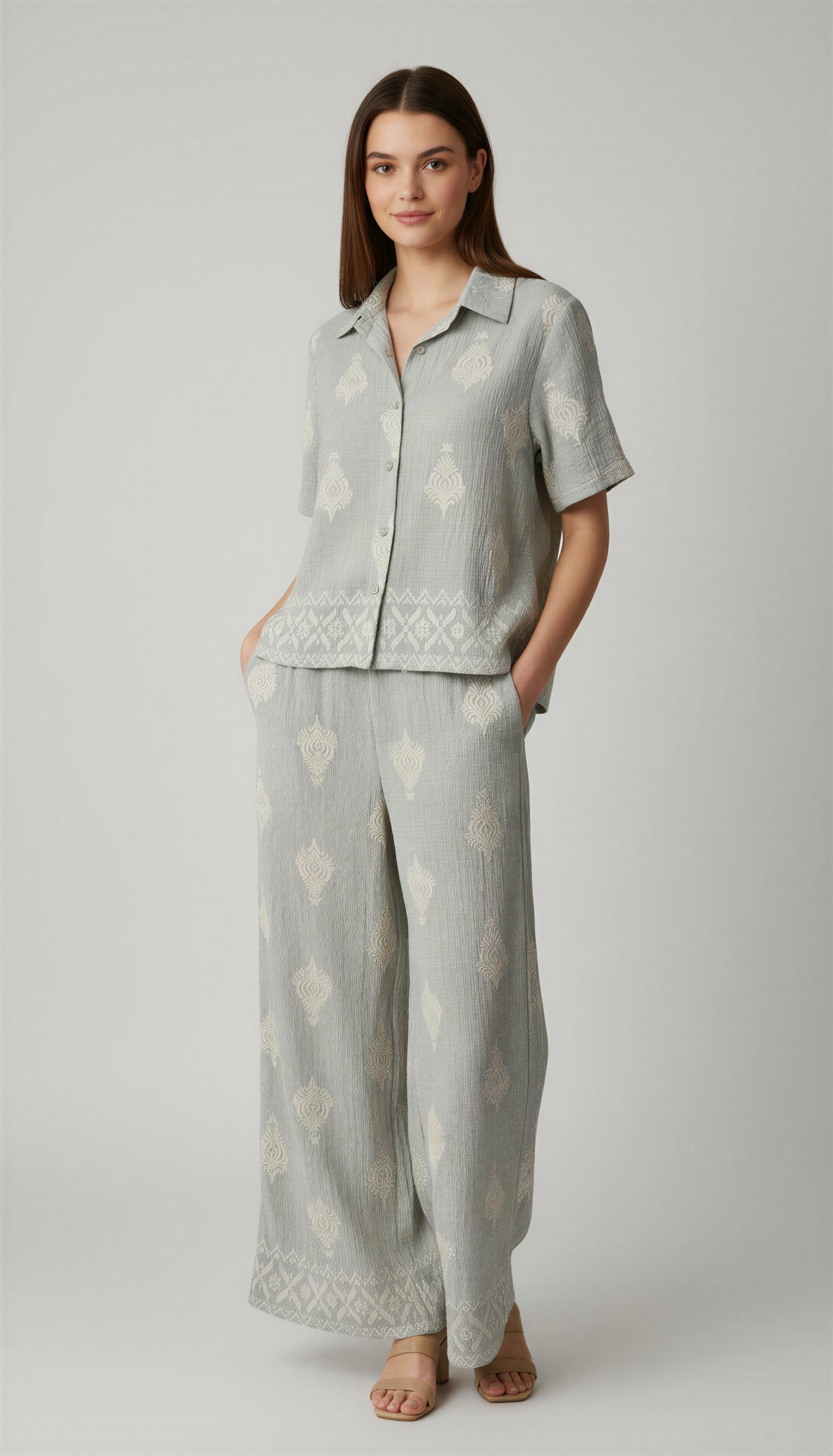 Conjunto de camisa y pantalón en tela lino grosor medio, con un estampado gofré (en realce). La camisa tiene cuello camisero, y manga al codo con puñito y botón. El pantalón tiene elástico en la cintura/espalda, y bolsillos en los costados.