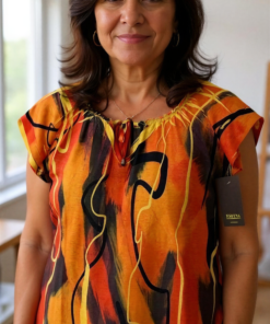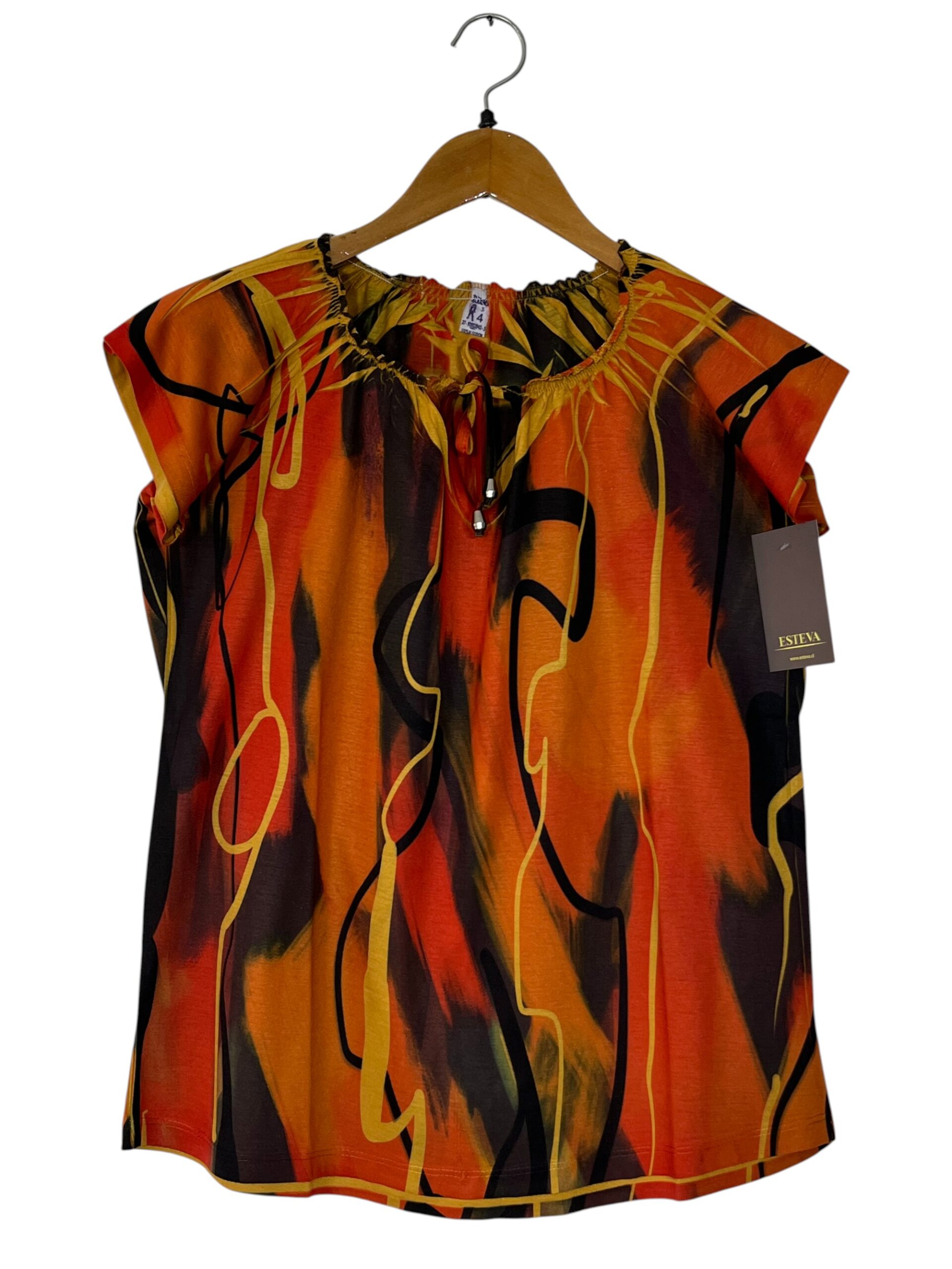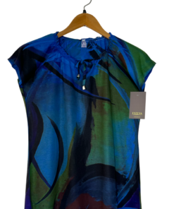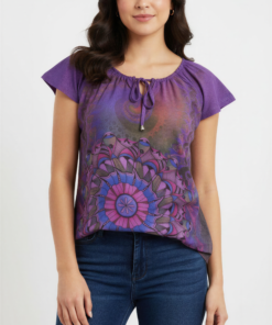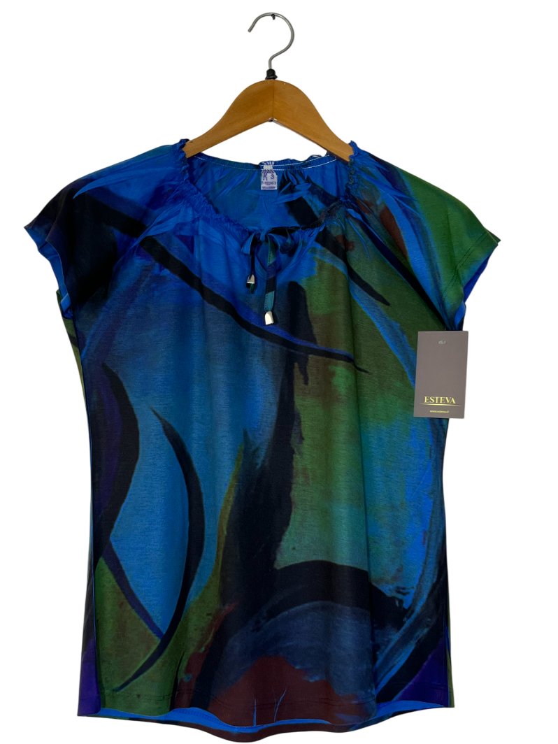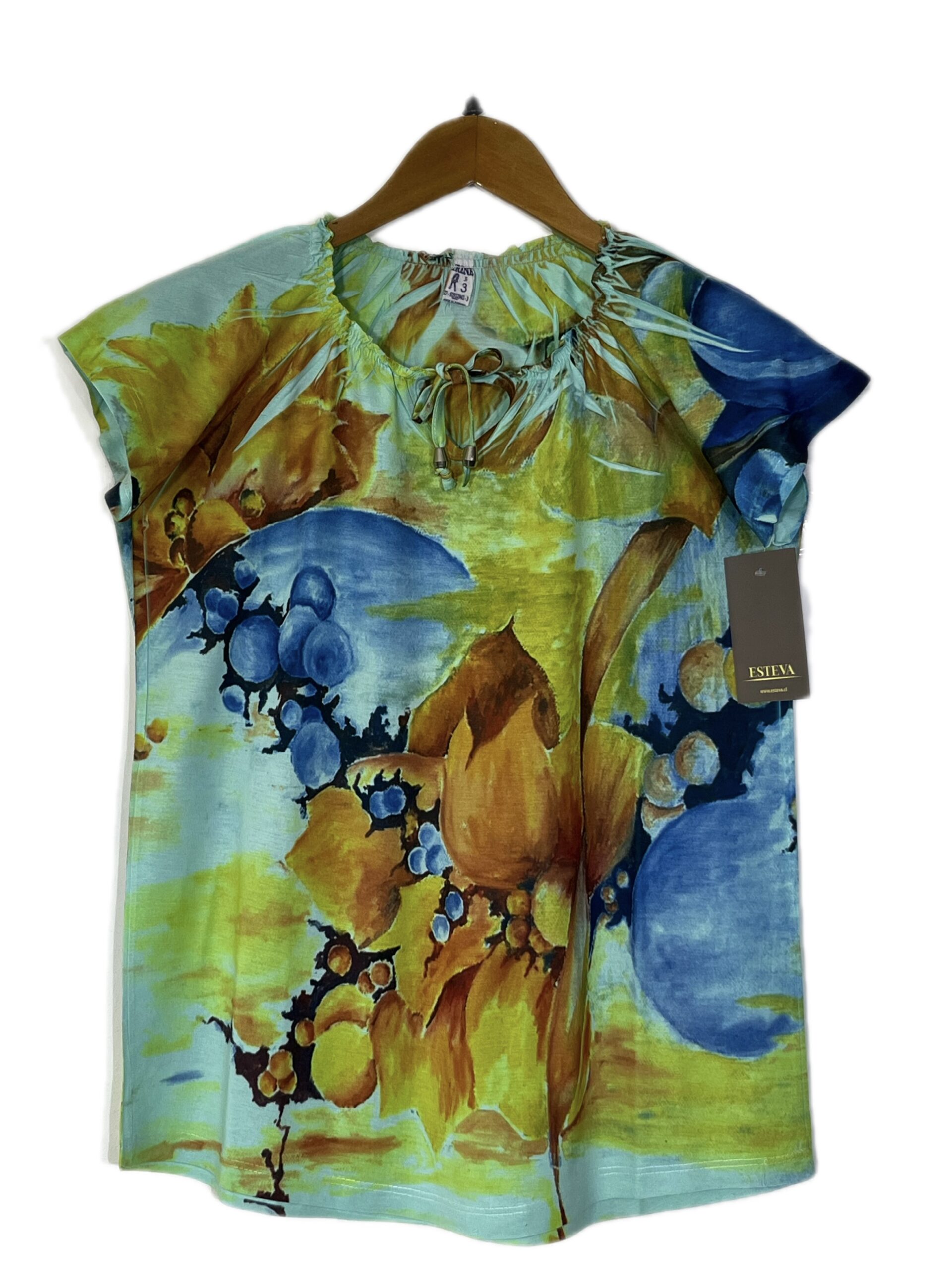 Fresca polera en algodón, estampado sublimado. Tiene recogido con elástico el cuello que la hace muy sentadora, y termina en una amarrita en el escote. Manga raglan cortita.
