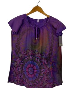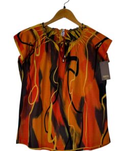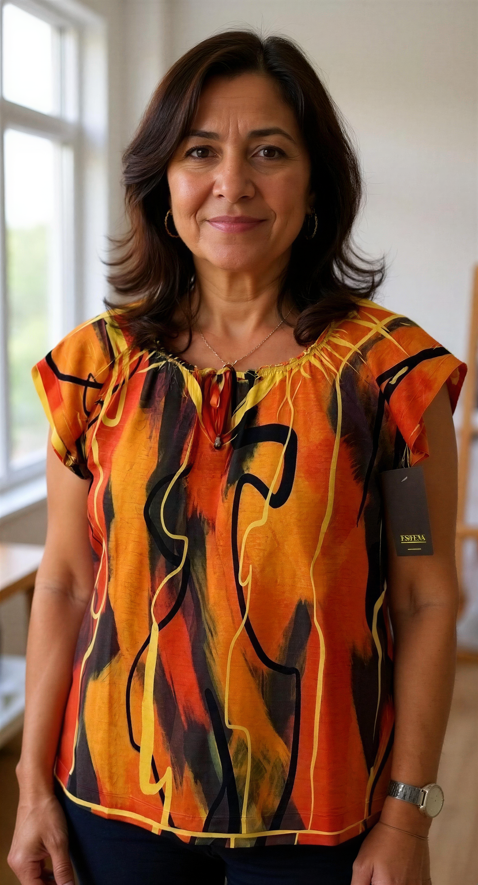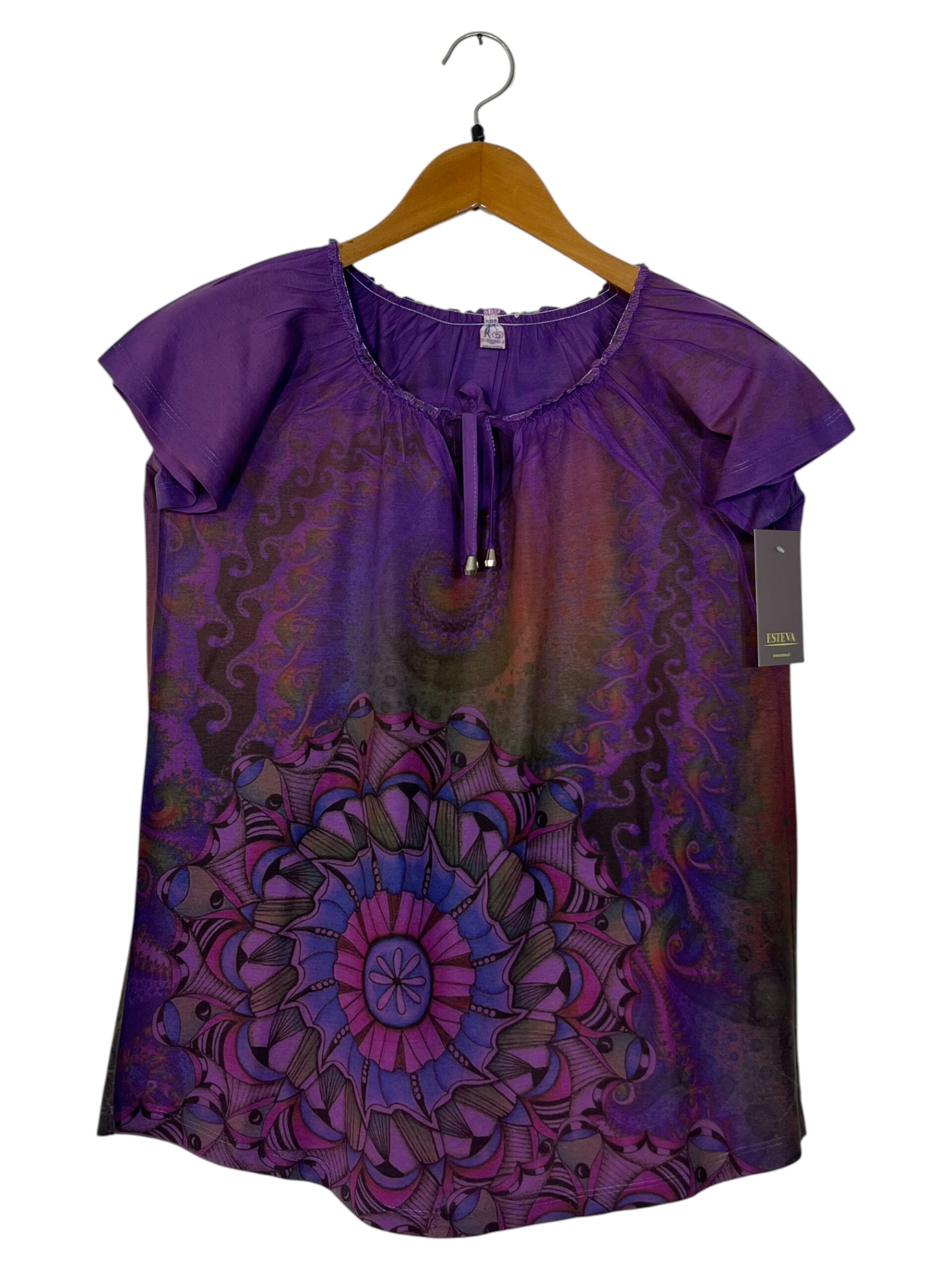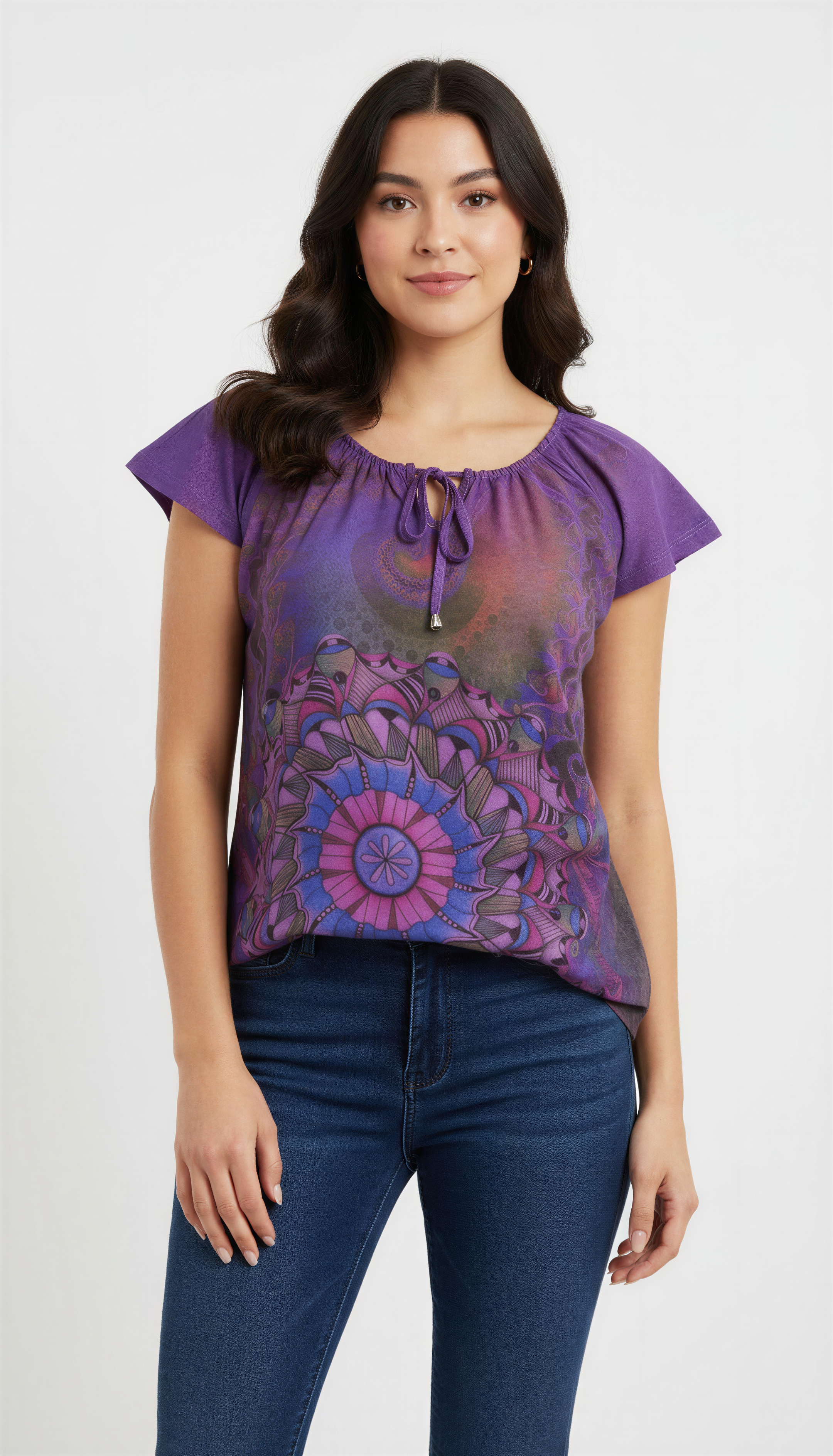 Fresca polera en algodón, estampado sublimado. Tiene recogido con elástico el cuello que la hace muy sentadora, y termina en una amarrita en el escote. Manga raglan cortita.